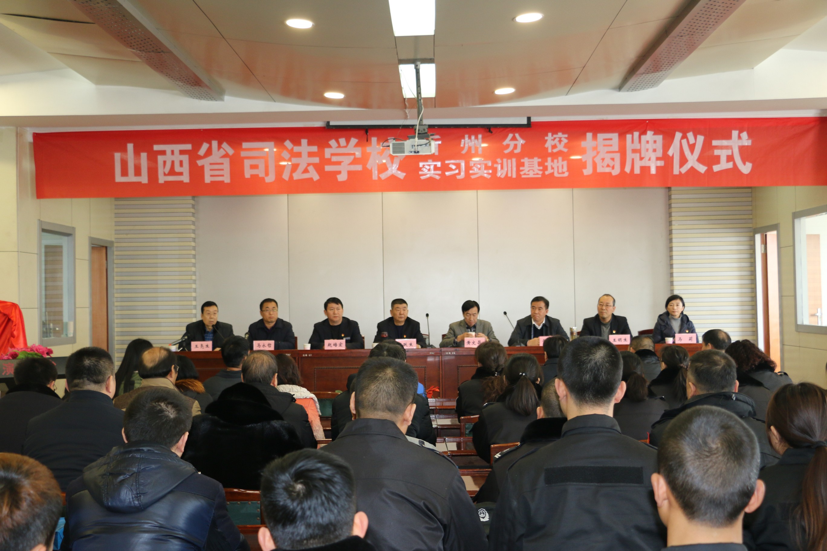 山西省司法學(xué)校忻州分校于2018年1月8日在我公司實(shí)訓(xùn)基地掛牌。公司總經(jīng)理張躍生、副總經(jīng)理趙培宏、王明生、總經(jīng)理助理羅鵬生、蔡車峰、高秀生、宋林兔等領(lǐng)導(dǎo)參加了掛牌儀式。