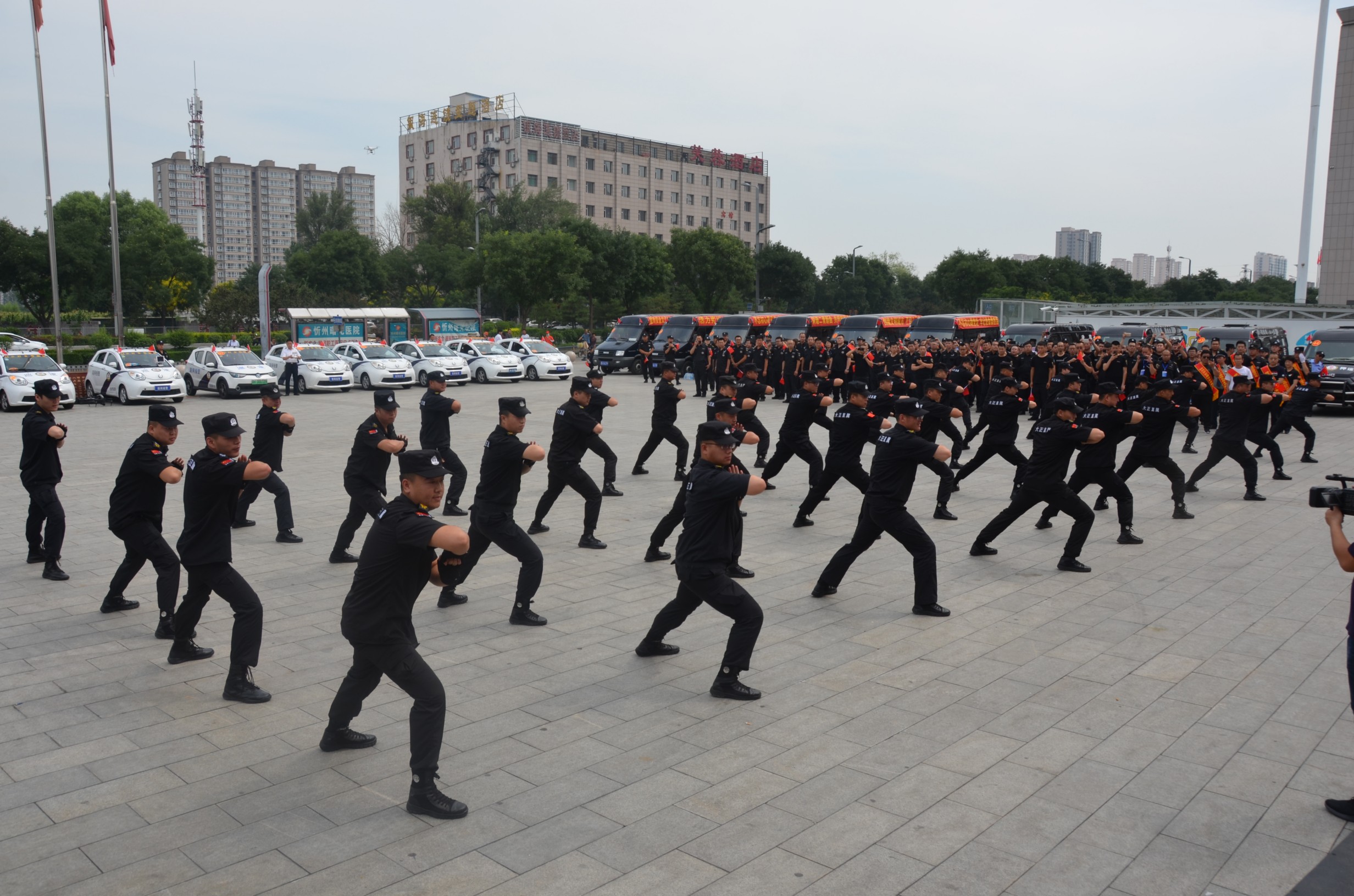 儀式在現(xiàn)場全體人員齊聲高唱的《歌唱祖國》歌聲中達(dá)到高潮,大家揮舞著手中的國旗,表達(dá)了對祖國的良好祝愿。山西大正保安服務(wù)有限公司保安隊員進(jìn)行了擒敵拳操展示,剛勁有力、整齊劃一的動作,體現(xiàn)出大正保安隊員苦練基本功的豐碩成果,展現(xiàn)了大正保安隊員良好的精神風(fēng)貌和戰(zhàn)無不勝、攻無不克的專業(yè)素養(yǎng)。儀式結(jié)束后,由各保安企業(yè)組織的30余輛保安業(yè)務(wù)車在忻州城區(qū)進(jìn)行巡回宣傳。