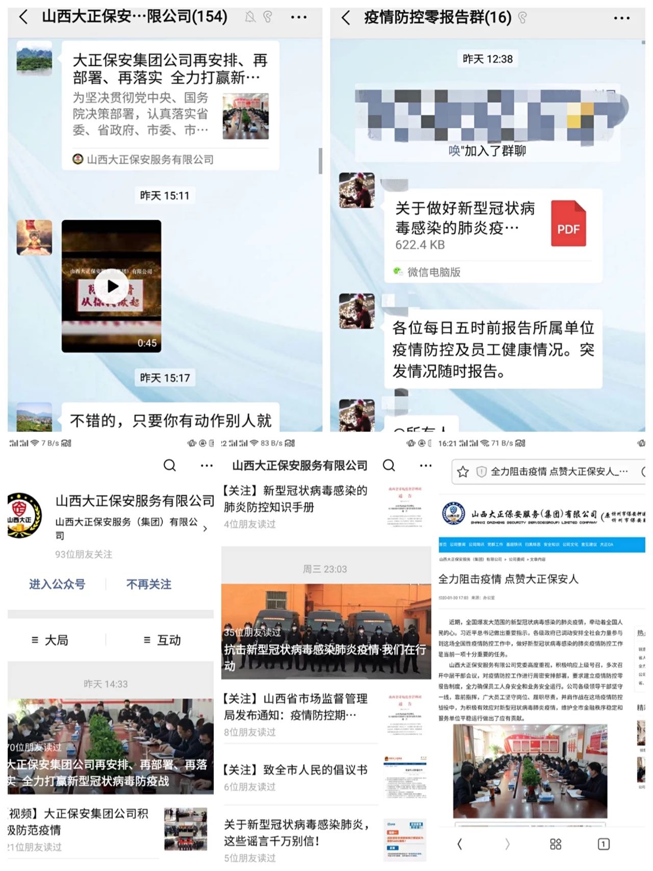為深入貫徹習(xí)近平總書記對新型冠狀病毒感染肺炎疫情防控工作的重要指示精神,堅(jiān)決落實(shí)黨中央重大決策部署及省委、市委、市國資委部署安排,山西大正保安服務(wù)(集團(tuán))有限公司印發(fā)《關(guān)于做好新型冠狀病毒感染的肺炎疫情防控工作的通知》、《山西大正保安服務(wù)有限公司關(guān)于印發(fā)落實(shí)山西省啟動(dòng)重大突發(fā)公共衛(wèi)生事件一級響應(yīng)工作方案的通知》,要求公司各部門把防控疫情作為當(dāng)前最重要的工作來抓,落實(shí)落細(xì)防控措施,切實(shí)保障員工安全,保障全市金融秩序穩(wěn)定和服務(wù)單位平穩(wěn)運(yùn)行。集團(tuán)公司黨委印發(fā)了落實(shí)在疫情防控工作中充分發(fā)揮黨組織和黨員作用的通知,要求基層黨支部、全體黨員深刻認(rèn)識疫情防控形勢,全面落實(shí)我市“五嚴(yán)五防”措施,用實(shí)際行動(dòng)踐行初心使命。