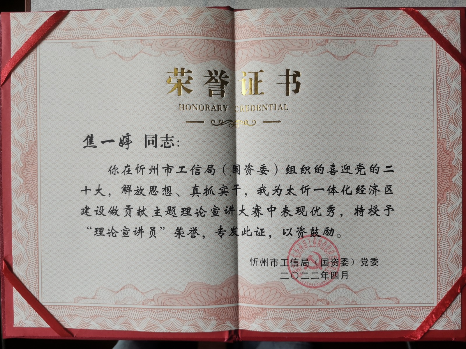 3月21日,以喜迎黨的二十大,解放思想、真抓實干,我為太忻一體化經(jīng)濟區(qū)建設(shè)做貢獻為主題的“忻州市第二屆理論宣講大賽”中,我公司參賽人員焦一婷緊扣演講主題,以“忻州市創(chuàng)建文明城市”為抓手,充分結(jié)合自己在創(chuàng)建文明城市中的所做、所見、所聞,就作為一名國企員工如何在工作中解放思想,真抓實干展開演講,用實實在在發(fā)生在身邊的志愿實例說明問題,通俗易懂,極富感染力。大賽組委會結(jié)合當前省內(nèi)疫情防控實際,開展線下比賽組織參賽選手以錄制視頻的形式參賽,最終經(jīng)過忻州市工信局(國資委)黨委的評比,參賽人員焦一婷榮獲“理論宣講員”稱號,并獲得獎品《人世間》、《創(chuàng)業(yè)史》書籍兩套。