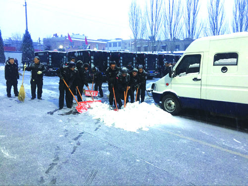 一上班,公司便安排機關職工、各駐勤點、中心庫隊員等清掃院內(nèi)、門外大街上的積雪,大家不畏嚴寒,頂著風雪,揮舞鐵鍬掃把,干的熱火朝天,不亦樂乎,忙碌的身影構成了一道亮麗的風景線。雖然室外溫度很低,但大家勞動的熱情和團結的力量讓這個冬日變得格外溫暖。經(jīng)過一個多小時的奮戰(zhàn),大家終于將機關、中隊院內(nèi)及附近主干道等地的積雪全部鏟除,為員工和附近居民開辟了一條洋溢著溫情的通暢之路。雖然大家的衣服、鞋子都弄濕了,也出了一身的汗,可看著眼前的成果,大家都很有成就感,每個人的臉上都洋溢著開心的笑容。