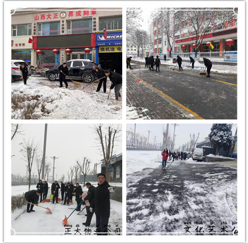 1月5日,2020年紛紛揚(yáng)揚(yáng)的一場(chǎng)大雪飄然而至,秀容大地銀裝素裹之間也讓道路覆蓋上了一層厚厚的積雪,不僅給市民出行帶來(lái)嚴(yán)重不便,也為公司開(kāi)展工作帶來(lái)諸多安全隱患。為此,公司主要領(lǐng)導(dǎo)親自安排,忻州城區(qū)及各縣分支機(jī)構(gòu)迅速行動(dòng)起來(lái)清除積雪,及時(shí)清掃各自駐地和周邊道路的積雪,用實(shí)際行動(dòng)為我市創(chuàng)文工作做出貢獻(xiàn)。
