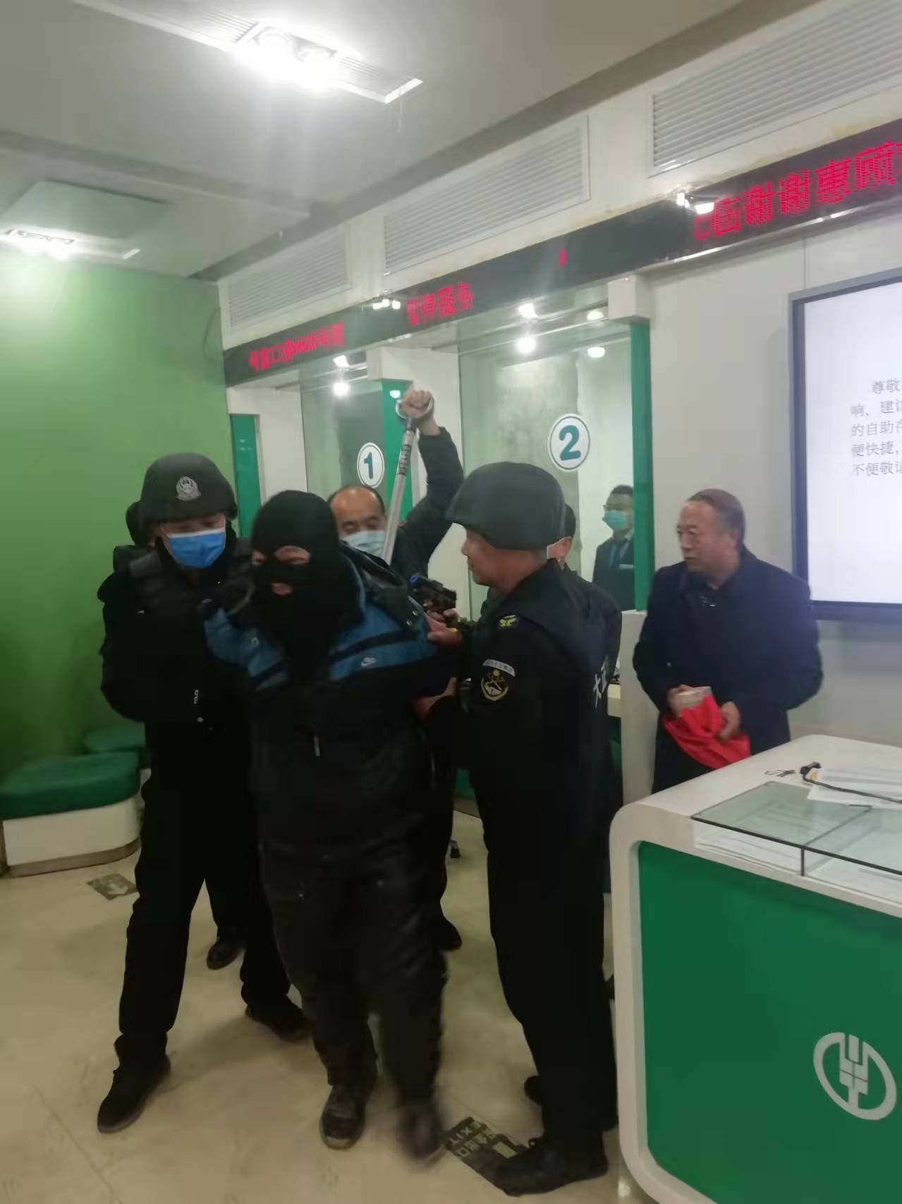 防搶劫演練在農(nóng)行網(wǎng)點(diǎn)按計(jì)劃開展,押運(yùn)人員在“歹徒”搶劫時(shí),臨危不懼,勇敢上前與之搏斗。最終,在大家的共同努力下,制服了“歹徒”。
