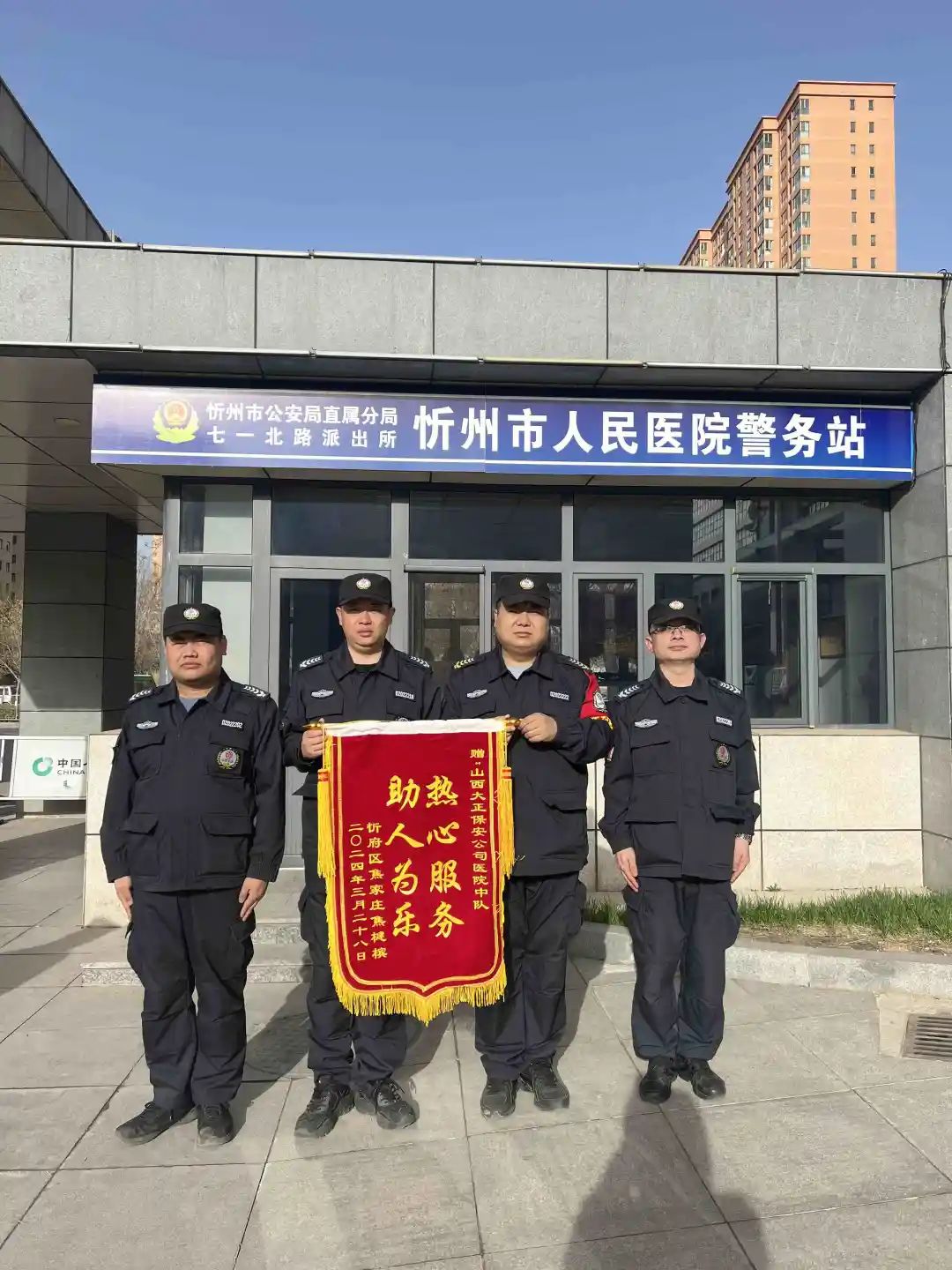 市人民醫(yī)院駐勤點中隊長期以來守職盡責(zé)、細查安全隱患,在面對不法分子毫不退怯,全力保護醫(yī)護人員不受傷害。對廣大患者的困難,主動伸手、幫助他人。市醫(yī)院駐勤中隊的行為,為山西大正樹立起敬業(yè)、友善的良好風(fēng)尚。他們堅守在醫(yī)院安保一線,更是在后方,成為醫(yī)護人員和患者最堅實的壁壘。他們是一支堅定而又溫暖有力量的隊伍,24小時的堅守,成為了醫(yī)院最堅定的守護者。