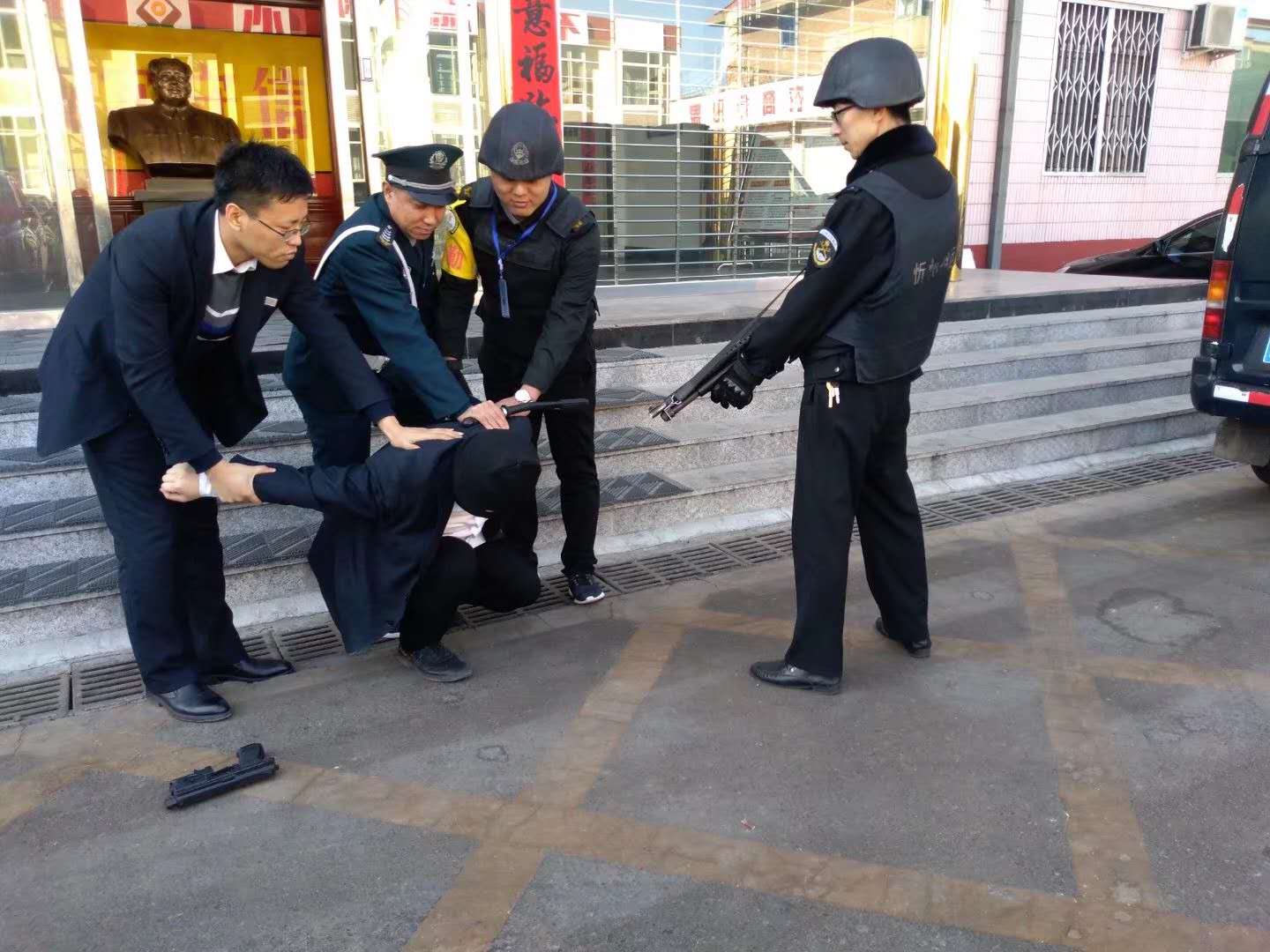 3月16日上午,守押繁峙中隊聯(lián)合農(nóng)商行組織隊員進行了一次反搶預案演練。演練內(nèi)容為運鈔車抵達網(wǎng)點后裝卸款箱時遭遇持械歹徒搶劫。整個演練過程,隊員準備充分、緊張有序、反應迅速、分工明確,拎包員迅速鎖閉金庫門,司機立即報警,押運員口頭警告無效后鳴槍示警,最終合力制服歹徒。